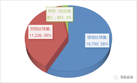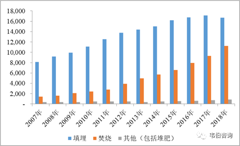 2018年,我國(guó)城市生活垃圾無害化處理量達(dá)到28,778萬噸,其中填埋處理量16,700萬噸,焚燒處理量11,226萬噸,其他(包括堆肥)處理量851萬噸。