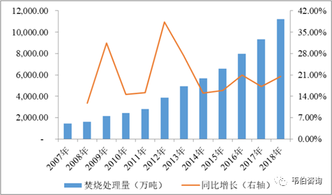 隨著城市生活垃圾“減量化、資源化、無害化”處理需求的日益增長(zhǎng),我國(guó)垃圾焚燒處理近年來發(fā)展迅速。據(jù)住房和城鄉(xiāng)建設(shè)部統(tǒng)計(jì):2007年至2018年,我國(guó)城市生活垃圾焚燒廠年實(shí)際處理量從1,446萬噸增長(zhǎng)到11,226萬噸,復(fù)合增長(zhǎng)率達(dá)20.48%。