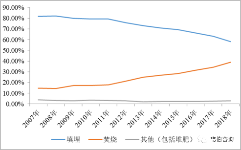 圖表5:2007年至2018年我國(guó)城市生活垃圾無害化處理方式占比變化情況