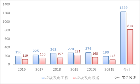 根據(jù)對(duì)光大國(guó)際、海螺創(chuàng)業(yè)、上海環(huán)境、偉明環(huán)保、綠色動(dòng)力等12家垃圾發(fā)電上市公司運(yùn)營(yíng)項(xiàng)目投資額的測(cè)算,得到2016-2019年垃圾發(fā)電項(xiàng)目單位投資成本由54萬元/(噸/日)提高至55萬元/(噸/日),假設(shè)2020年單位投資成本小幅提升至56萬元/(噸/日);考慮典型的垃圾發(fā)電項(xiàng)目投資結(jié)構(gòu),工程土建、工程安裝、設(shè)備以及其他分別占比25%、13%、38%、24%,同時(shí)假設(shè)垃圾焚燒發(fā)電項(xiàng)目建設(shè)周期為18個(gè)月,T年投運(yùn)的項(xiàng)目在T-2/T-1/T年的建設(shè)期分別為2.5/10/5.5個(gè)月,則2016-2021年間垃圾發(fā)電總工程及設(shè)備市場(chǎng)規(guī)模分別達(dá)到1229億元和814億元。