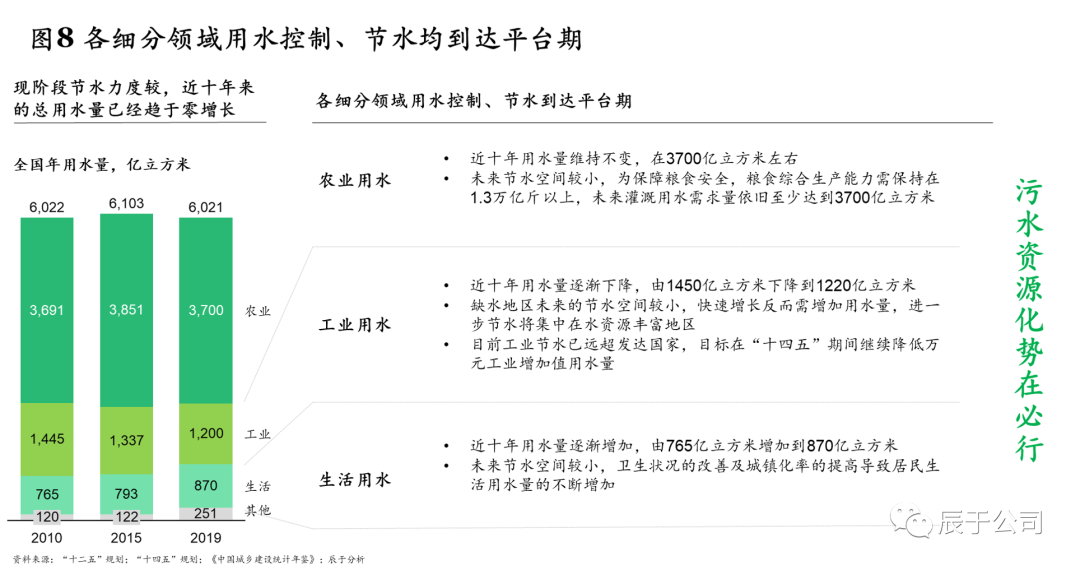 一是南水北調(diào)超規(guī)劃、用水控制到達(dá)平臺(tái)期,污水資源化需求釋放。截至2018年底,中線(xiàn)調(diào)水超155億立方米,京津地區(qū)調(diào)水量已超規(guī)劃,新的解決方案已提上日程;用水控制方面,各細(xì)分領(lǐng)域均到達(dá)平臺(tái)期,未來(lái)節(jié)水空間較小,以農(nóng)業(yè)用水為例,近十年其用水量基本維持不變,在3700億立方米左右,而為保障糧食安全,糧食綜合生產(chǎn)能力需保持在1.3萬(wàn)億斤以上,對(duì)應(yīng)的灌溉用水需求量至少應(yīng)達(dá)到3700億立方米(見(jiàn)圖8)。