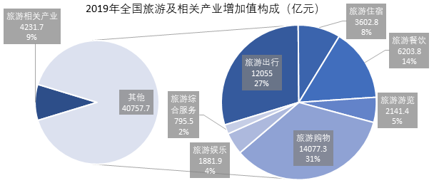 根據《國家旅游及相關產業(yè)統(tǒng)計分類(2018)》(表1),可將旅游產業(yè)分為旅游出行、住宿、餐飲、游覽等九大類。2019年全國國內游客共60.1億人次,旅游及相關產業(yè)增加值為 44,989億元,約占全年生產總值(GDP)的4.56%,占服務業(yè)生產總值的8.42%。其內部結構占比如圖1所示。其中旅游購物(31%)和出行(27%)的規(guī)模最大,分別創(chuàng)造了14,077億元和12,055億元的增加值。