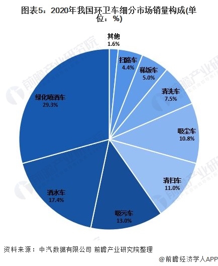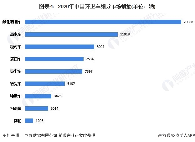 從各功能車輛種類來看,2020年綠化噴灑車、灑水車、吸污車、清掃車、吸塵車五類車型的比重總占比達到80%以上。其中,綠化噴灑車市場占比高達30%,銷量為20068輛,同比增長19.1%。