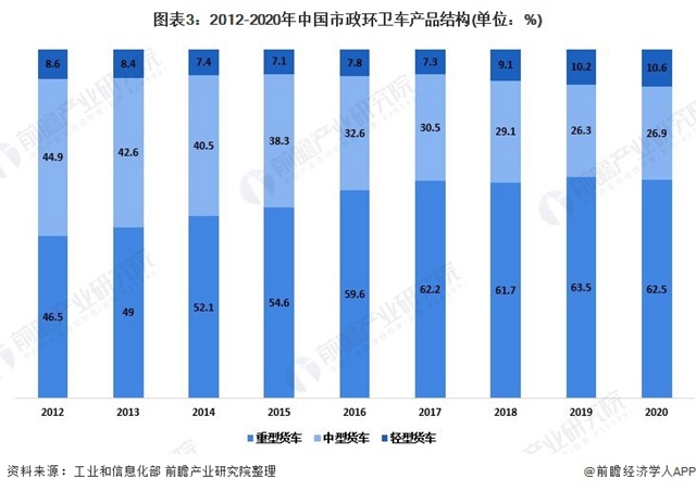 從車型結構來看,重型產(chǎn)品的比重已經(jīng)從2012年的46.5%增長到2020年的62.5%。從近幾年的產(chǎn)品結構趨勢來看,市政環(huán)衛(wèi)產(chǎn)品重型化趨勢十分明顯,重型產(chǎn)品的比重不斷提升,中型產(chǎn)品市場份額受到擠壓,同時輕型產(chǎn)品份額也有所提升,產(chǎn)品呈現(xiàn)出向重型、輕型兩極發(fā)展的趨勢。