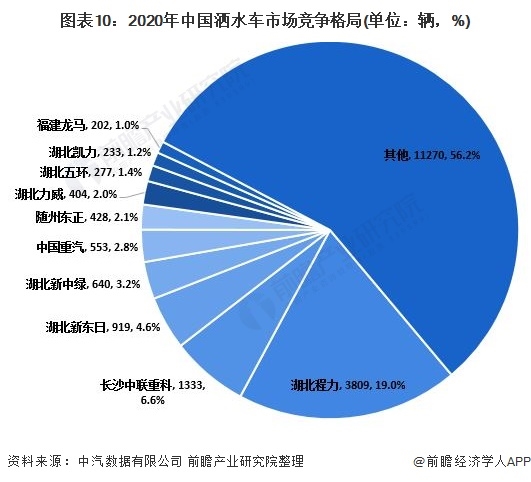 在灑水車市場中,銷量TOP10企業(yè)集中度為43.8%,較2019年同期下滑了16個百分點,企業(yè)集中度大幅下滑。其中湖北程力專用汽車有限公司銷量達到3809輛,市場份額占比為19.0%。
