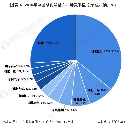 在綠化噴灑車市場中,銷量TOP10企業(yè)集中度為74%,較2019年同期下滑了7.5個百分點。其中湖北程力專用汽車有限公司銷量達到7214輛,市場份額占比為35.9%,在綠化噴灑車市場中占據(jù)了絕對優(yōu)勢。
