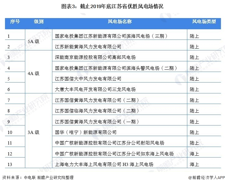 截止2019年底,江蘇省共有13個優(yōu)勝風電場,全國排名第9,其中5A級有2個,4A級有4個,3A級有7個。按風電場類型分類,江蘇省入選的優(yōu)勝風電場有11個是陸上風電場,2個是海上風電場。