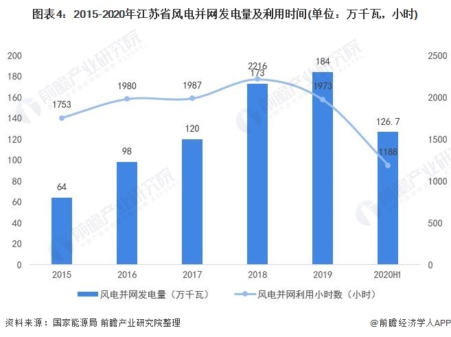 在利用小時方面,江蘇省風電并網(wǎng)利用小時數(shù)在2019年有所下滑,同比下滑10.97%。2020年上半年,江蘇省風電并網(wǎng)利用小時為1188小時。