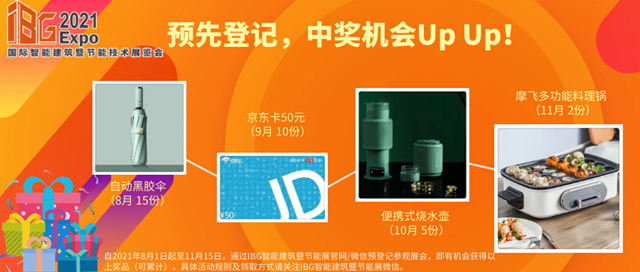 據(jù)悉,“IBG國際智能建筑暨節(jié)能技術(shù)展覽會”觀眾預(yù)登記已開啟,自8月開始至11月預(yù)登記的觀眾有機(jī)會享自動黑膠傘、京東卡、便攜式燒水壺、摩飛多功能料理鍋等實用好禮!活動獎品可累計,越早登記中獎機(jī)會越多。主辦方期待于2021年11月30日-12月2日與更多業(yè)內(nèi)人士相聚上海新國際博覽中心,共筑智能建筑生態(tài)圈!