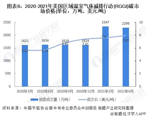 2020-2021年,美國RGGI碳市場價(jià)格呈上升趨勢。RGGI碳市場的初始配額發(fā)放以拍賣為主,每個(gè)季度舉行一次拍賣。2021年第一季度拍賣成交均價(jià)為$7.60美元,較上一季度漲幅為2.5%。由于弗吉尼亞州的加入,RGGI總成交量創(chuàng)歷史新高,達(dá)到了2347萬噸。2021年第二季度,美國RGGI拍賣成交均價(jià)為7.97美元,較上一季度漲幅為4.9%,總成交量為2299萬噸。