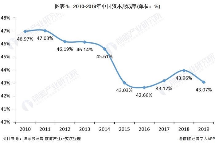 2007年以來,中國資本形成率(一定時期內(nèi)資本形成總額占國內(nèi)生產(chǎn)總值的比重)維持在40%以上,2011年為47.03%,為近些年資本形成率最高年份,隨后呈下降趨勢,2019年資本形成率達43.07%。資本形成率有待提升。