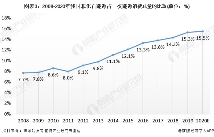 從我國對能源的依存情況來看,化石能源仍是主要消費對象。統(tǒng)計數(shù)據(jù)顯示,2008-2013年,非化石能源(水電、風電、太陽能、生物質(zhì)能等)占一次能源消費總量的比重均低于10%,之后該比重持續(xù)上升,至2019年該比重達到15.3%。未來,當經(jīng)濟增速逐漸提高時,化石能源的消費還會大幅增長,非化石能源的占比可能還會面臨下降的風險。
