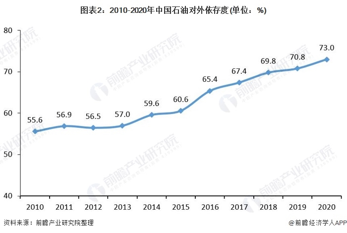 根據(jù)中國石油經(jīng)濟技術研究院發(fā)布的《2020年國內(nèi)外油氣行業(yè)發(fā)展報告》,2020年,中國石油對外依存度(一個國家原油凈進口量占本國石油消費量的比例)達到73%。