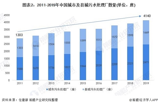 截止2019年底,我國城市污水處理廠達到4140座,城市污水處理廠和縣城污水處理廠分別為2471座和1669座。