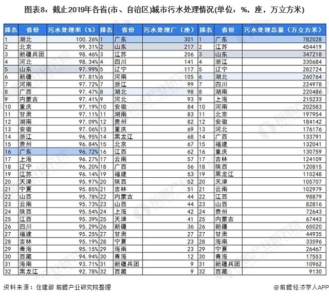 注:污水處理率為前瞻根據(jù)住建部公布的各省(市、自治區(qū))縣城污水排放量及污水處理量數(shù)據(jù)進行的測算,污水處理率=各省(市、自治區(qū))縣城污水處理量/污水排放量。