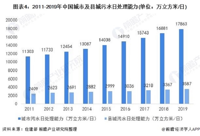 圖表4:2011-2019年中國城市及縣城污水日處理能力(單位:萬立方米/日)
