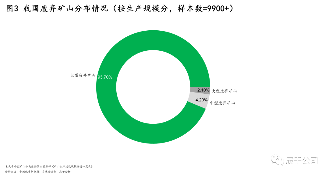 根據(jù)中國(guó)地質(zhì)調(diào)查局對(duì)國(guó)內(nèi)9900多座廢棄礦山的統(tǒng)計(jì)數(shù)據(jù)顯示,小型廢棄礦山占93.7%,中型、大型則分別占4.2%、2.1%(見(jiàn)圖3)。由于小型廢棄礦山數(shù)量多、規(guī)模小、碎片化、流動(dòng)性大等問(wèn)題,礦山生態(tài)修復(fù)責(zé)任主體缺失嚴(yán)重。