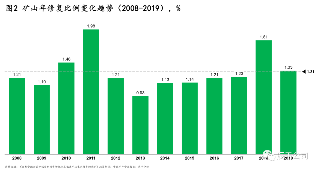 然而,這一巨大潛在市場(chǎng)空間尚未有效釋放,過(guò)去10年我國(guó)每年礦山生態(tài)修復(fù)面積的比例均不高于2%(見(jiàn)圖2),礦山生態(tài)修復(fù)形勢(shì)并不樂(lè)觀(guān)。