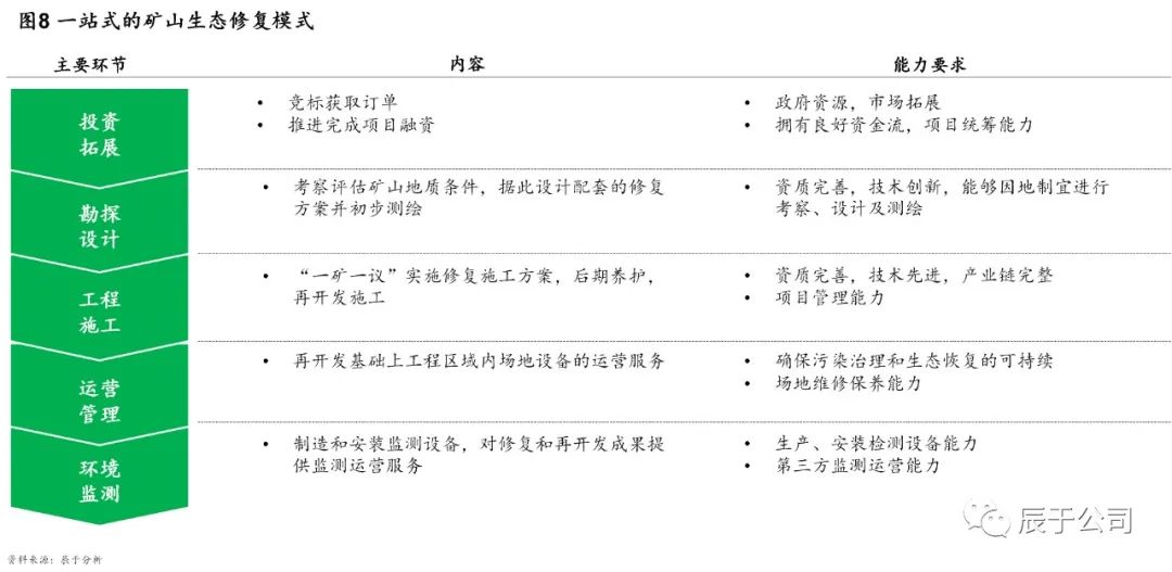 參考國(guó)際成熟經(jīng)驗(yàn),我們認(rèn)為未來(lái)EPC仍然是主流模式。不過(guò)隨著推進(jìn)大礦山生態(tài)修復(fù)勢(shì)在必行,預(yù)計(jì)PPP項(xiàng)目數(shù)量將有所增加,尤其是遼寧、河南、山東、內(nèi)蒙古等礦山生態(tài)修復(fù)走在前列的省份值得關(guān)注。當(dāng)然,這對(duì)入局企業(yè)也提出了更高要求,他們不僅要有較強(qiáng)的政府資源和市場(chǎng)拓展能力,還要關(guān)注礦山生態(tài)修復(fù)多環(huán)節(jié)的打通,提升諸如生態(tài)環(huán)境考察評(píng)估、破壞診斷、方案設(shè)計(jì)、修復(fù)系統(tǒng)構(gòu)造、生態(tài)景觀(guān)建設(shè)、系統(tǒng)跟蹤與維護(hù)、環(huán)境監(jiān)測(cè)等各項(xiàng)能力,打造一站式整體修復(fù)模式(見(jiàn)圖7)。