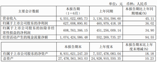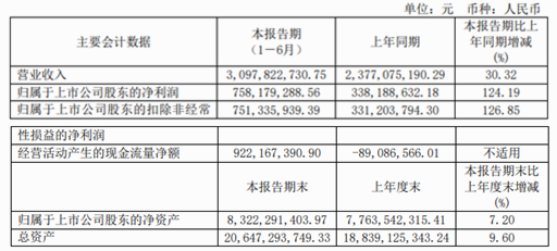 截至報(bào)告期內(nèi),公司經(jīng)營狀況持續(xù)走高,實(shí)現(xiàn)營業(yè)收入21.62億元,較上年增長199.93%;實(shí)現(xiàn)歸母凈利潤51.03億元,較上年增長7.7%。