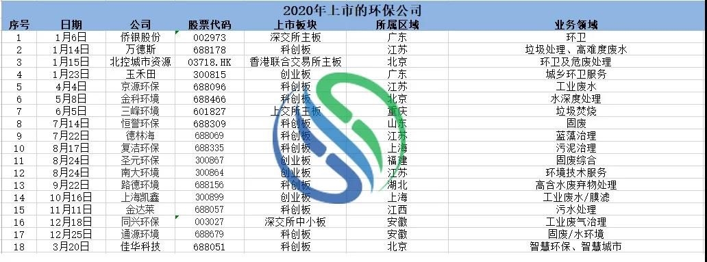 2020年,疫情之下,我國多層次資本市場啟動全面深化改革,這一年新三板精選層開閘、創(chuàng)業(yè)板實施注冊制、新三板轉(zhuǎn)板規(guī)則出爐、科創(chuàng)板迎來開板一周年……隨之而來的是中國IPO大年,在整體相對寬松的資本市場環(huán)境下,有近30家環(huán)保企業(yè)上市過會,其中18家掛牌上市,包括僑銀環(huán)保、在垃圾焚燒發(fā)電行業(yè)奮斗20余年的三峰環(huán)境,以及登陸科創(chuàng)板的萬德斯、金科環(huán)境、復(fù)潔環(huán)保、路德環(huán)境、京源環(huán)保、恒譽環(huán)保、通源環(huán)境、金達(dá)萊、德林海,登陸創(chuàng)業(yè)板的南大環(huán)境、圣元環(huán)保、玉禾田、上海凱鑫等。