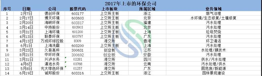 這要從2017年IPO開閘說起,這個時期,環(huán)保企業(yè)迎來上市高峰,這一年國家產(chǎn)業(yè)政策鼓勵節(jié)能環(huán)保企業(yè)上市融資,支持企業(yè)利用資本市場做大做強,據(jù)中國水網(wǎng)當(dāng)時的不完全統(tǒng)計,2017年成功上市的環(huán)保企業(yè)有:博天環(huán)境、德創(chuàng)環(huán)保、滇池水務(wù)、中國光大綠色環(huán)保、海峽環(huán)保、聯(lián)泰環(huán)保、上海環(huán)境、上海洗霸、萬成環(huán)球控股、興瀘水務(wù)、中持股份、中環(huán)環(huán)保等14家之多。