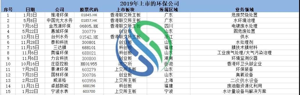 2019年,科創(chuàng)板開板,雖然當(dāng)年科創(chuàng)板還未成大氣候,但科創(chuàng)板勢頭已經(jīng)有了,多家環(huán)保企業(yè)沖刺科創(chuàng)板,其中以膜技術(shù)膜材料為主營業(yè)務(wù)的三達(dá)膜、聚焦工業(yè)廢氣處理/大氣污染治理的奧福環(huán)保、專注廢油脂資源化利用的卓越新能于年內(nèi)成功登陸科創(chuàng)板。這一年共有15家環(huán)境公司上市,包括三家科創(chuàng)板、四家創(chuàng)業(yè)板、三家上交所主板與五家港股企業(yè)。值得一提的是,這一年光大水務(wù)也成功在港交所上市,成功實現(xiàn)新加坡香港兩地雙重上市,而此前同為光大集團下屬的光大綠色環(huán)保剛剛在2017年登陸港交所。