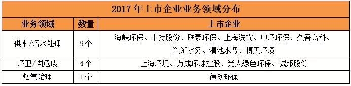 2017年上市的環(huán)保企業(yè)業(yè)務(wù)領(lǐng)域還比較集中,大致可歸納為供水/水處理、環(huán)衛(wèi)/固危廢、煙氣治理等三大領(lǐng)域,上市企業(yè)幾乎是清一色的以環(huán)保PPP、BOT工程投資運營驅(qū)動做大的業(yè)界頭部企業(yè),如老牌固廢國企上海環(huán)境、水業(yè)十大影響力企業(yè)中持股份、光大集團旗下光大綠色環(huán)保以及中環(huán)環(huán)保、博天環(huán)境、興瀘水務(wù)、滇池水務(wù)等。