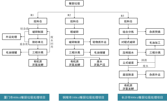 廈門(mén)市餐廚垃圾處理項(xiàng)目于2020年開(kāi)始建設(shè),設(shè)計(jì)處理規(guī)模400t/d,采用“接料粗分+精分制漿+除砂除渣+油水分離”的預(yù)分選技術(shù),分離雜物和油脂后的有機(jī)漿料采用厭氧發(fā)酵進(jìn)行資源化利用。銅陵市餐廚垃圾項(xiàng)目于2020年投入使用,設(shè)計(jì)處理規(guī)模為100t/d,采用“粗破碎+破碎制漿除砂+油水分離”的預(yù)分選技術(shù),分離雜物和油脂后的有機(jī)漿料采用厭氧發(fā)酵進(jìn)行資源化利用。長(zhǎng)沙市餐廚垃圾處理項(xiàng)目于2012年投入使用,并于2018年擴(kuò)建至800t/d處理量,采用“組合分揀+油水分離+制漿”的預(yù)分選技術(shù),分離雜物和油脂后的有機(jī)漿料采用厭氧發(fā)酵進(jìn)行資源化利用。