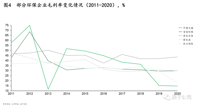 因此,地方政府一方面想辦法壓低項目盈利水平降低投入,一方面尋求其他“合法”融資渠道解困。近年來大型生態(tài)環(huán)保企業(yè)的盈利水平逐步下降印證了項目盈利降低的趨勢(見圖),盈利就幾個點,融資成本極低的大型國企、央企在競爭中處于優(yōu)勢,幾個點的融資成本決定了項目的成與否;尋找融資渠道下,地方生態(tài)環(huán)保集團應運而生,對跨市統(tǒng)籌、投資公益性回報比較差的項目等,將起到積極的作用。