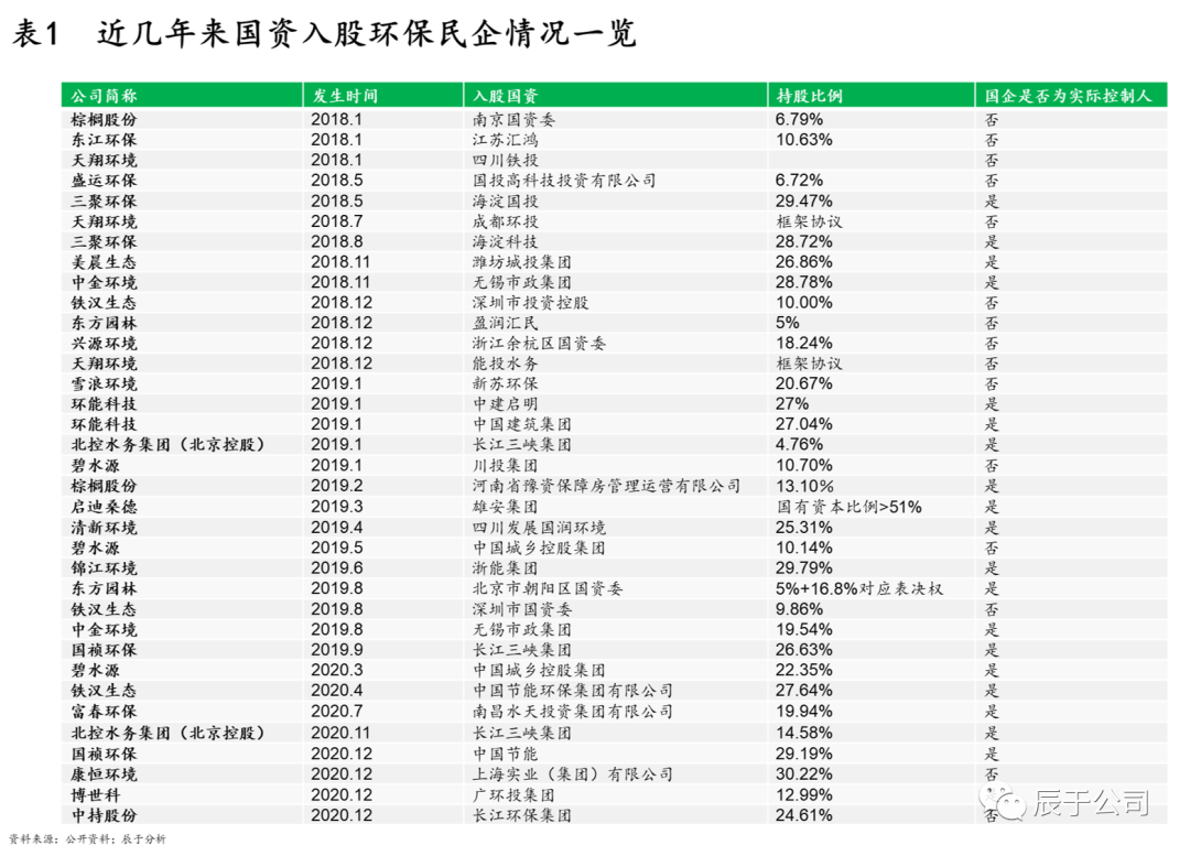 據(jù)不完全統(tǒng)計,從2018年開始,頭部環(huán)保民營企業(yè)“投身”國資的趨勢加快,從2018年到2020年,有超過34家民營企業(yè)迎來國資的入股,超過50%的企業(yè)實(shí)際控制人變更為國資(見表1)。