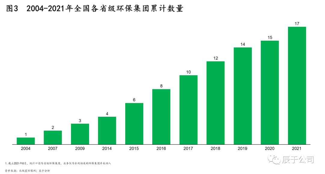 從“十二五”開始,就有地方生態(tài)環(huán)保集團(tuán)成立,但“十三五”中后期至今頻率明顯變高。例如,初步統(tǒng)計已有超過20家省級生態(tài)環(huán)保集團(tuán),大多都是在“十三五”后期成立的,大概每年都會有2~3家(見圖3)。