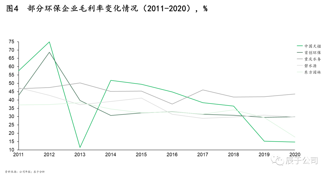 因此,地方政府一方面想辦法壓低項目盈利水平降低投入,一方面尋求其他“合法”融資渠道解困。近年來大型生態(tài)環(huán)保企業(yè)的盈利水平逐步下降印證了項目盈利降低的趨勢(見圖),盈利就幾個點(diǎn),融資成本極低的大型國企、央企在競爭中處于優(yōu)勢,幾個點(diǎn)的融資成本決定了項目的成與否;尋找融資渠道下,地方生態(tài)環(huán)保集團(tuán)應(yīng)運(yùn)而生,對跨市統(tǒng)籌、投資公益性回報比較差的項目等,將起到積極的作用。