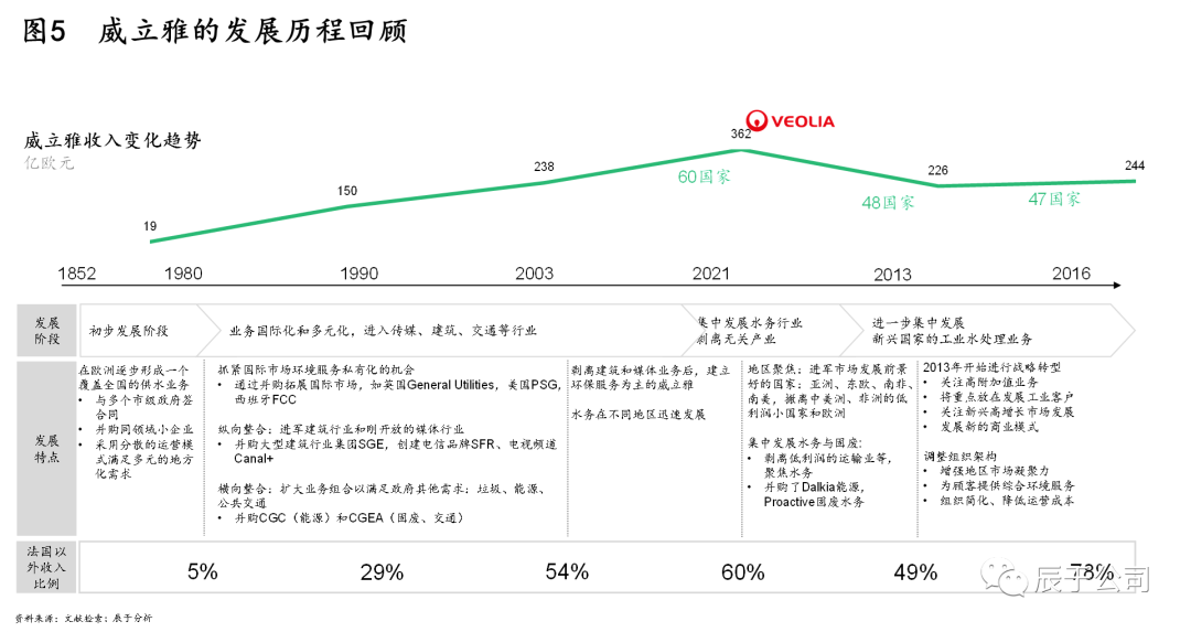 任何大企業(yè)的長成都不是一日之功,全球生態(tài)環(huán)保巨頭威立雅的發(fā)展之路照樣坎坷,歷經(jīng)160年發(fā)展,直到上世紀(jì)80年代后才真正開始走上快速發(fā)展的道路,經(jīng)歷了之后30年的擴(kuò)張(見圖5)。