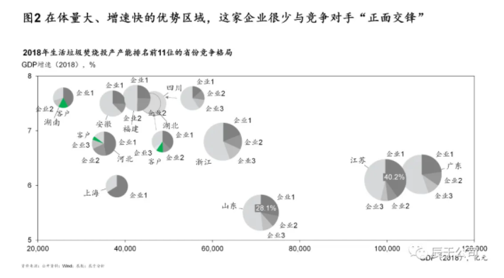 這是我們服務(wù)過的一家全國性生態(tài)環(huán)保企業(yè)的區(qū)域布局(見圖2,為保護(hù)隱私,數(shù)據(jù)已做處理),可以看到,在那些規(guī)模大、增速快的地區(qū),這家企業(yè)的市場占有率很低,盡管它的規(guī)模已位居全國前20強(qiáng)。這種“劍走偏鋒”其實(shí)反映出生態(tài)環(huán)保市場競爭的無奈:時至今日,“關(guān)系”似乎仍然是決定項目能否拿到手的最重要因素,技術(shù)、產(chǎn)品、運(yùn)營、品牌都不重要,但唯獨(dú)不能沒有關(guān)系。上述的這些區(qū)域正是這家企業(yè)的“關(guān)系”所在。