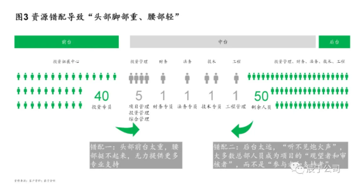 不難發(fā)現(xiàn),近年來一些企業(yè)開始“招兵買馬”,大量招聘投資拓展人員,這對于企業(yè)提高投資拓展能力自然是好事。不過我們也注意到,一些企業(yè)在投資相關(guān)的人員配置上卻不盡合理:他們通常把大量投資拓展人員“撒在前線”,同時建立“大后臺”,與投資相關(guān)的投管、財務(wù)、法務(wù),甚至技術(shù)、工程、運(yùn)營等人員主要負(fù)責(zé)項目質(zhì)量把關(guān)和風(fēng)險管控,只有少量人員在中臺為前臺提供“彈藥”和支持(見圖3)。這種“頭重腳重”帶來兩個“錯配”,一是頭部前臺太重,腰部挺不起來,無力提供更多專業(yè)支持;二是腳部后臺太遠(yuǎn),“聽不見炮火聲”,大多數(shù)人成為項目的“觀望者和審核者”,而不是“參與者和支持者”。