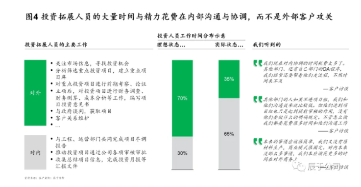 理想狀態(tài)下,對外對內(nèi)工作的時間分配比例應(yīng)該是7:3,甚至更高也不為過,但現(xiàn)實(shí)往往相反,由于內(nèi)部協(xié)同效率不高、流程繁冗、“人治”問題嚴(yán)重,我們發(fā)現(xiàn)一些投資拓展人員更多的時間與精力花費(fèi)在內(nèi)部溝通與協(xié)調(diào),而不是外部客戶攻關(guān)(見圖4)。造成這種現(xiàn)象的原因,表面看上去是內(nèi)部流程繁瑣,決策鏈條冗長,實(shí)則是內(nèi)部沒有形成一以貫之以市場為導(dǎo)向、以項目為核心的理念文化。平時大多只是喊喊口號而已,并未真正付諸行動。