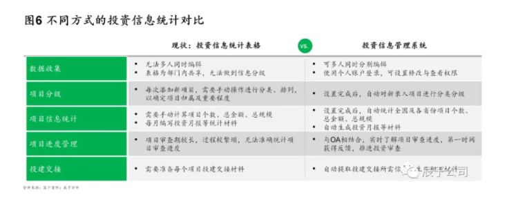 此外,我國生態(tài)環(huán)保產(chǎn)業(yè)數(shù)字化滲透率尚處于較低水平,即使是頭部企業(yè),也僅是在財務(wù)、行政、人力資源、工程等條線進(jìn)行了IT系統(tǒng)建設(shè),投資管理的IT系統(tǒng)建設(shè)很少,更別提利用大數(shù)據(jù)、機(jī)器學(xué)習(xí)、人工智能等先進(jìn)技術(shù)為投資決策提供支持了,不管是數(shù)據(jù)收集、還是項目分級、信息統(tǒng)計、進(jìn)度管理、投建交接等工作,基本依靠手動操作,效率低下且容易出錯(見圖6)。