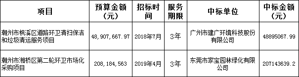 2019年4月份,潮州市湘橋區(qū)第二輪環(huán)衛(wèi)市場(chǎng)化采購(gòu)項(xiàng)目公開招標(biāo),預(yù)算金額為208,184,563元,服務(wù)期為3年,最終,東莞市家寶園林綠化有限公司以207143639.19元的價(jià)格中標(biāo)。
