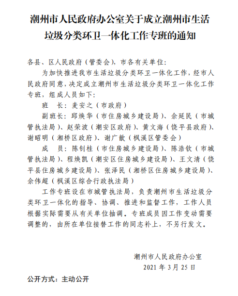 此外,2021年3月份,潮州市人民政府辦公室就發(fā)布了《關(guān)于成立潮州市生活垃圾分類環(huán)衛(wèi)一體化工作專班的通知》,提到,工作專班設(shè)在市城管執(zhí)法局,負(fù)責(zé)潮州市生活垃圾分類環(huán)衛(wèi)一體化的指導(dǎo)、協(xié)調(diào)、推進(jìn)和監(jiān)督工作。