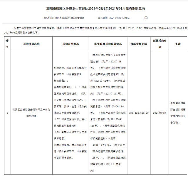即將在9月份采購(gòu)的湘橋區(qū)生活垃圾分類和環(huán)衛(wèi)一體化實(shí)施項(xiàng)目和楓溪區(qū)生活垃圾分類和環(huán)衛(wèi)一體化實(shí)施項(xiàng)目,總投資超10億元,這么高額的預(yù)算費(fèi)用用來用于潮州市環(huán)衛(wèi)一體化改革,充分說明了潮州市政府對(duì)環(huán)衛(wèi)一體化改革的重視程度之高,最終誰能奪得兩項(xiàng)目,中國(guó)固廢網(wǎng)將持續(xù)關(guān)注——