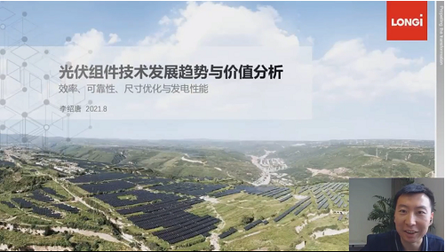 隆基樂葉光伏高級產(chǎn)品經(jīng)理李紹唐博士帶來了主題為《光伏組件技術(shù)發(fā)展趨勢與價值分析——效率,可靠性,尺寸優(yōu)化與發(fā)電性能》的分享
