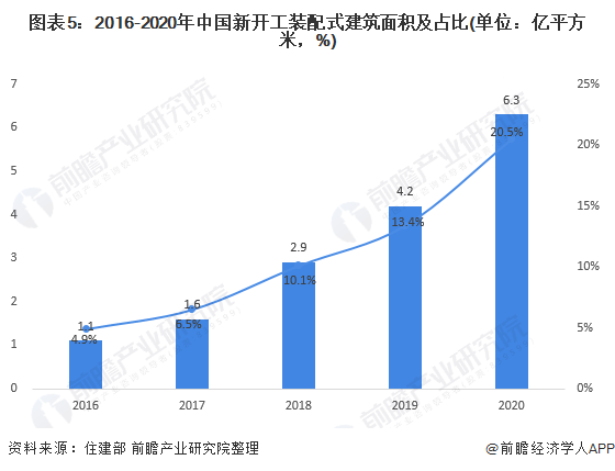 隨著各地積極推進(jìn)裝配式建筑項(xiàng)目落地,我國新建裝配式建筑規(guī)模不斷壯大。截至2020年末,全國31個(gè)省、自治區(qū)、直轄市和新疆生產(chǎn)建設(shè)兵團(tuán)新開工裝配式建筑共計(jì)6.3億平方米,較2019年增長50%,占新建建筑面積的比例約為20.5%。