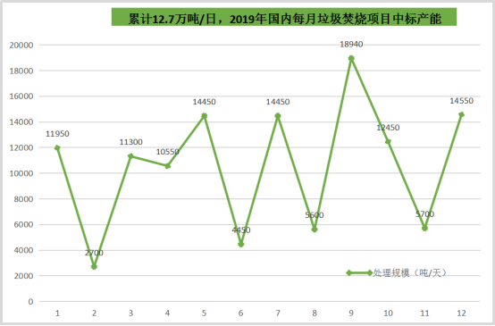 圖二:2019國(guó)內(nèi)每月新中標(biāo)垃圾焚燒產(chǎn)能規(guī)模圖▼