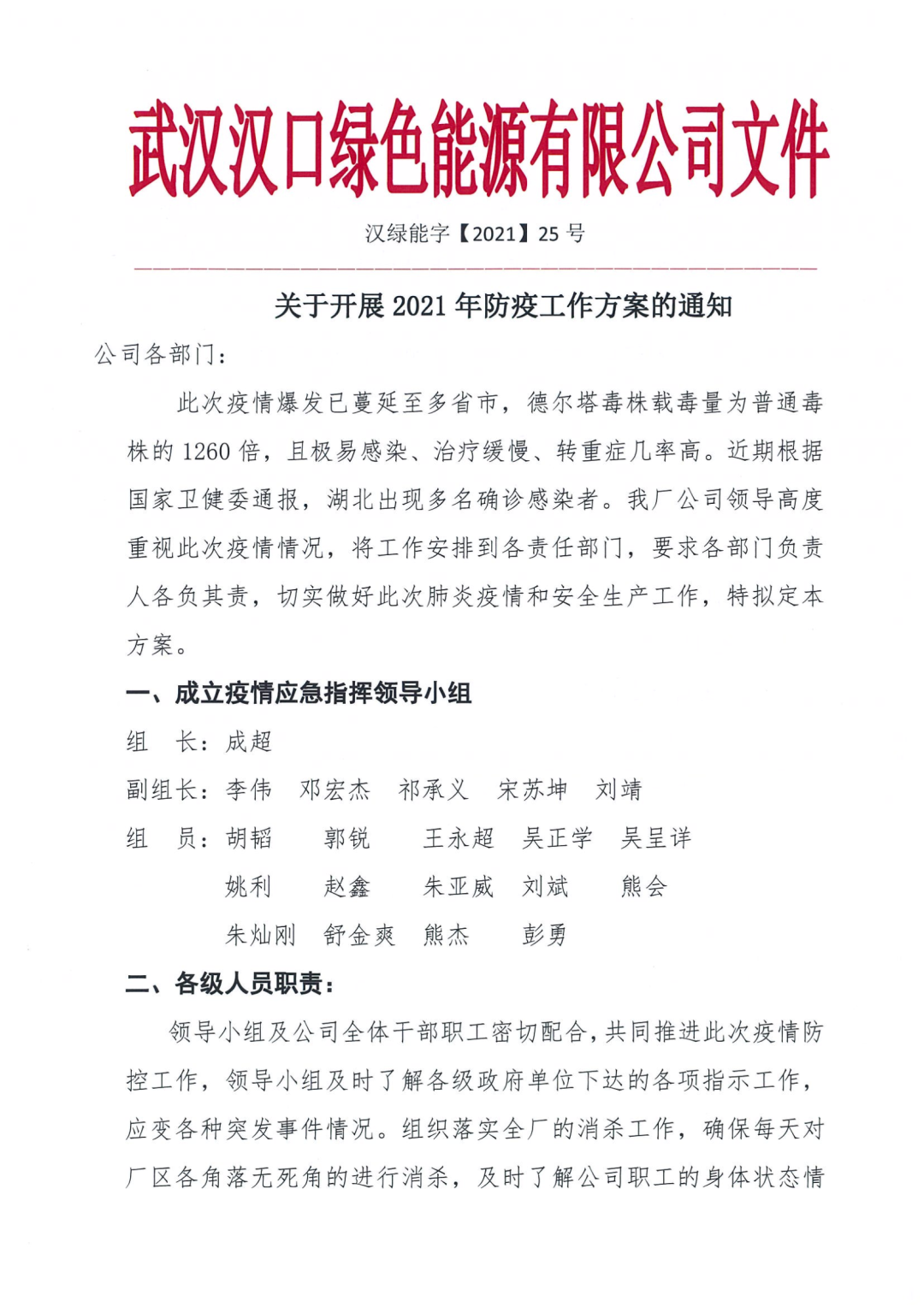 同日,漢口垃圾發(fā)電廠發(fā)布《關于開展2021年防疫工作方案的通知(漢綠能字【2021】25號)通知》,迅速成立電廠疫情應急指揮小組,對各部門、各級人員疫情防控職責及防疫措施進行了明確。