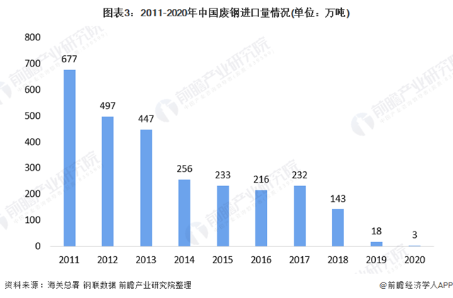2019年7月1日起,國家將廢鋼鐵、銅廢碎料、鋁廢碎料等8個品種的固體廢物從《非限制進口類可用作原料的固體廢物目錄》調(diào)入《限制進口類可用作原料的固體廢物目錄》等,2019年全年累計進口廢鋼僅18萬噸, 同比下降 86.28%。2020年繼續(xù)下降,進口總量為2.71萬噸,同比減少 85.28%。