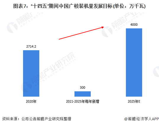 根據(jù)《十四五規(guī)劃和2035年愿景目標(biāo)綱要》,“十四五”期間,我國(guó)核電運(yùn)行裝機(jī)容量達(dá)到7000萬千瓦。中國(guó)廣核作為我國(guó)核電行業(yè)的龍頭企業(yè),也提出了其十四五發(fā)展目標(biāo):“十四五”期間,中國(guó)廣核將保持每年300萬千瓦以上發(fā)展速度,預(yù)計(jì)到“十四五”末,中廣核境內(nèi)新能源在運(yùn)裝機(jī)總?cè)萘繉⑼黄?000萬千瓦。