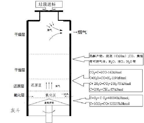 干燥后的垃圾逐漸降至熱解段,在控制的缺氧條件下有機(jī)物發(fā)生熱解,生成可燃?xì)怏w和灰渣。在熱分解段和氣化燃燒段分解成一氧化碳、氣態(tài)烴類(lèi)等混合物進(jìn)入混合煙氣中。熱解氣化后的殘留物(液態(tài)焦油、較純的碳素及垃圾本身含有的無(wú)機(jī)灰土和惰性物質(zhì)) 進(jìn)入燃燒層充分燃燒。燃燒層沿高度方向可分為氧化區(qū)和還原區(qū)。