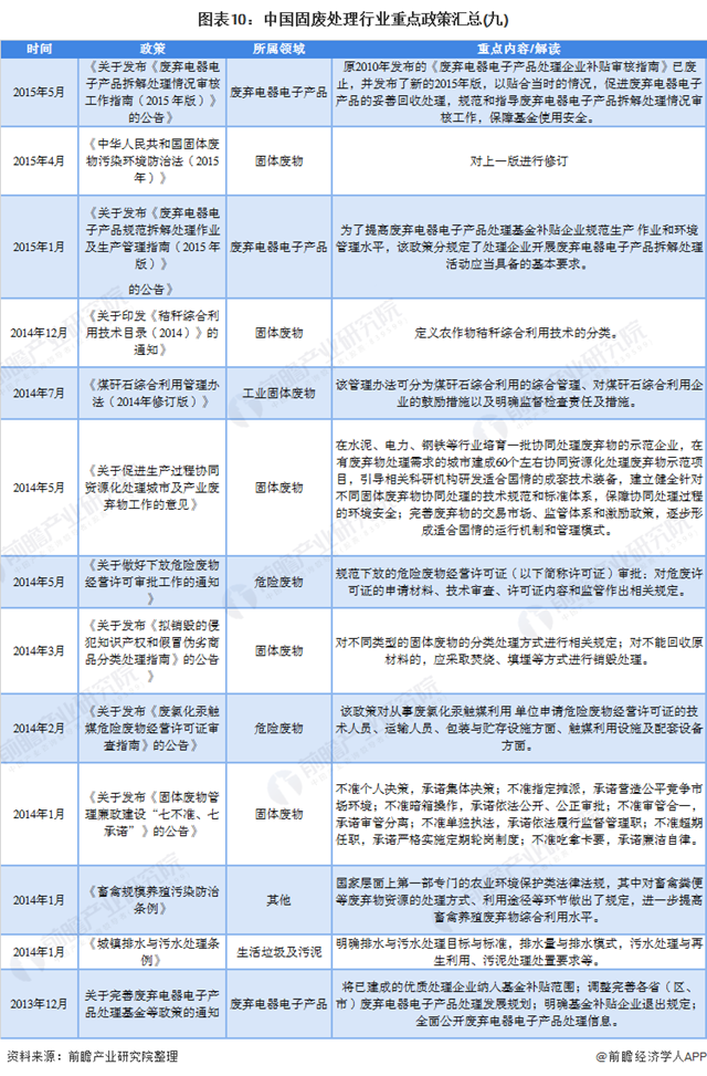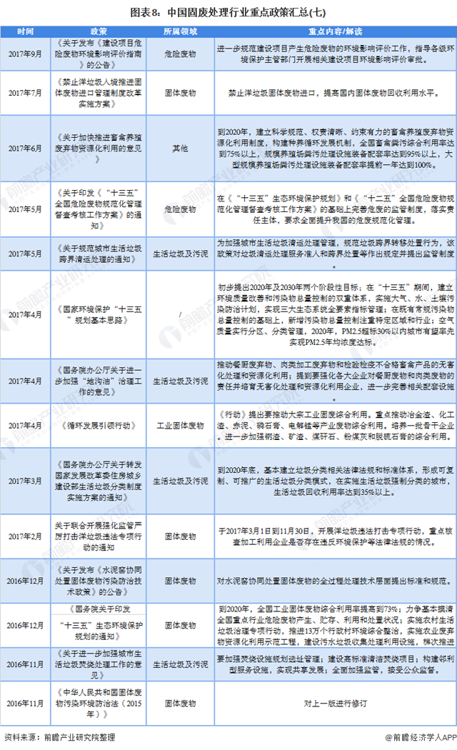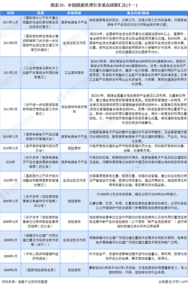我國固廢行業(yè)相關(guān)的重點(diǎn)政策針對方面主要可分為綜合固體廢物、危險(xiǎn)廢物、工業(yè)固體廢物、廢棄電器電子產(chǎn)品、生活垃圾及污泥及其他,在該基礎(chǔ)上,針對不同方面出臺了數(shù)量相當(dāng)?shù)恼咭砸?guī)定和支持固廢處理及其相關(guān)產(chǎn)業(yè)(例如,垃圾焚燒發(fā)電等)的產(chǎn)業(yè)化發(fā)展。