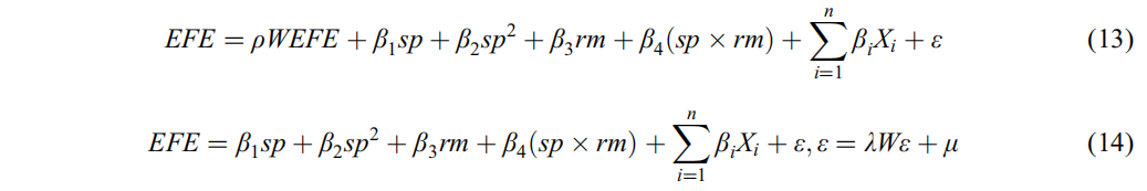 其中,EFE指生態(tài)效率;W為空間權(quán)重矩陣;μ表示隨機誤差項??刂谱兞堪夹g(shù)發(fā)展水平(tec)、人均土地承載力(ec)、自然人口增長率(pop)、產(chǎn)業(yè)所有制結(jié)構(gòu)(os)、互聯(lián)網(wǎng)普及率(int)、消費水平(CPI)、政府調(diào)控經(jīng)濟的能力(gfe)、工業(yè)企業(yè)的環(huán)境保護程度(iep)。